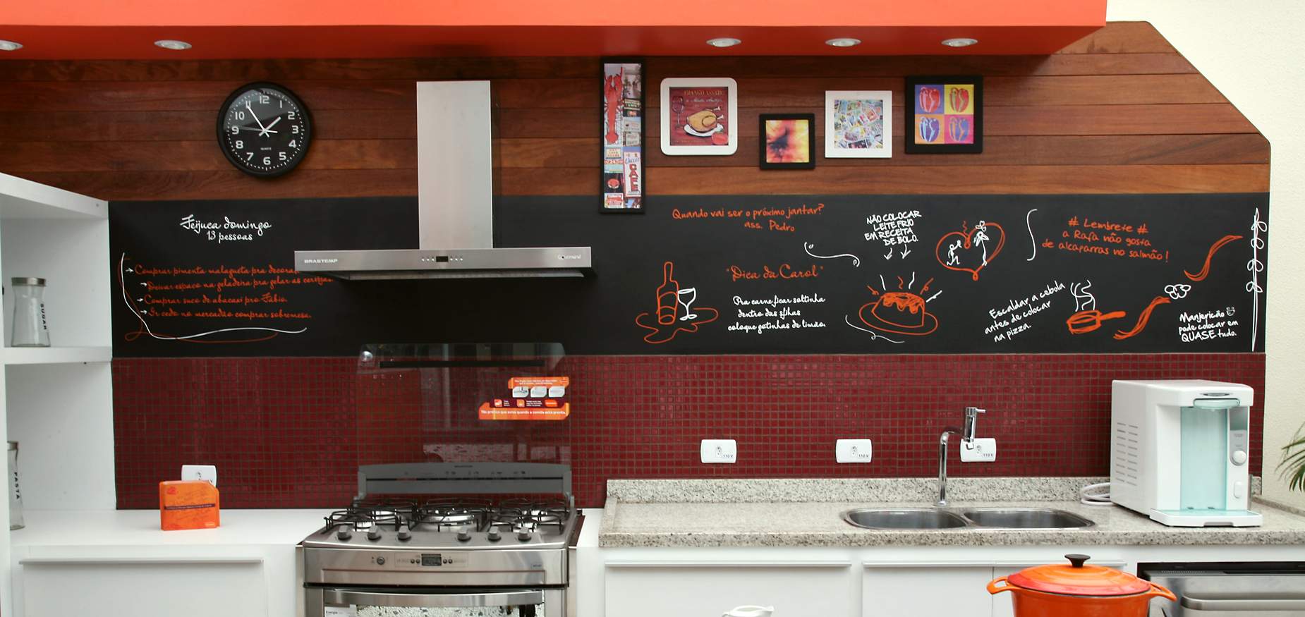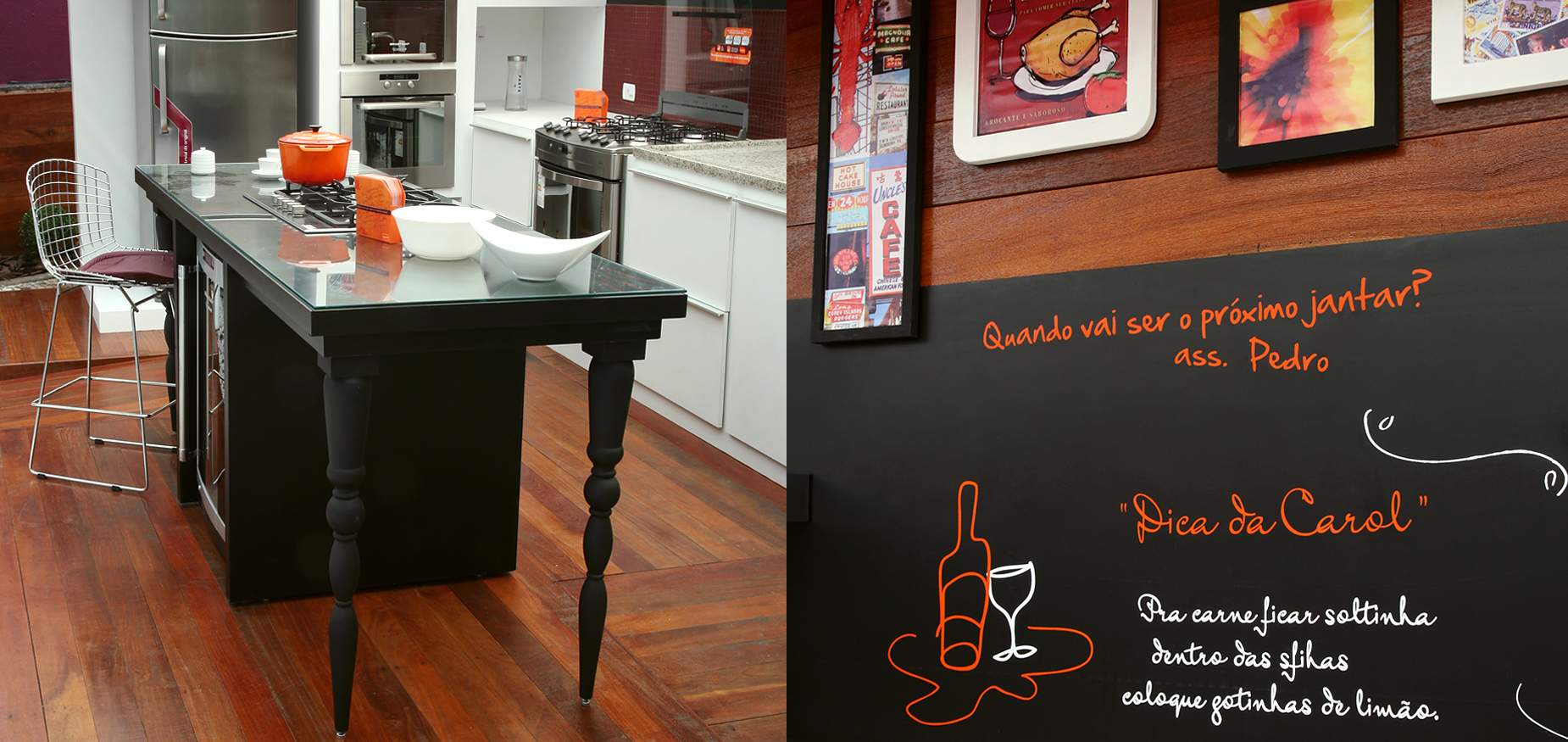 Uma mistura de elementos clássicos e contemporâneos num resultado equilibrado e aconchegante. Lousa, madeira, vidro e metal se conectam em harmonia. Utensílios e peças decorativas complementam a proposta, num resultado único que reflete o criativo universo da gastronomia.