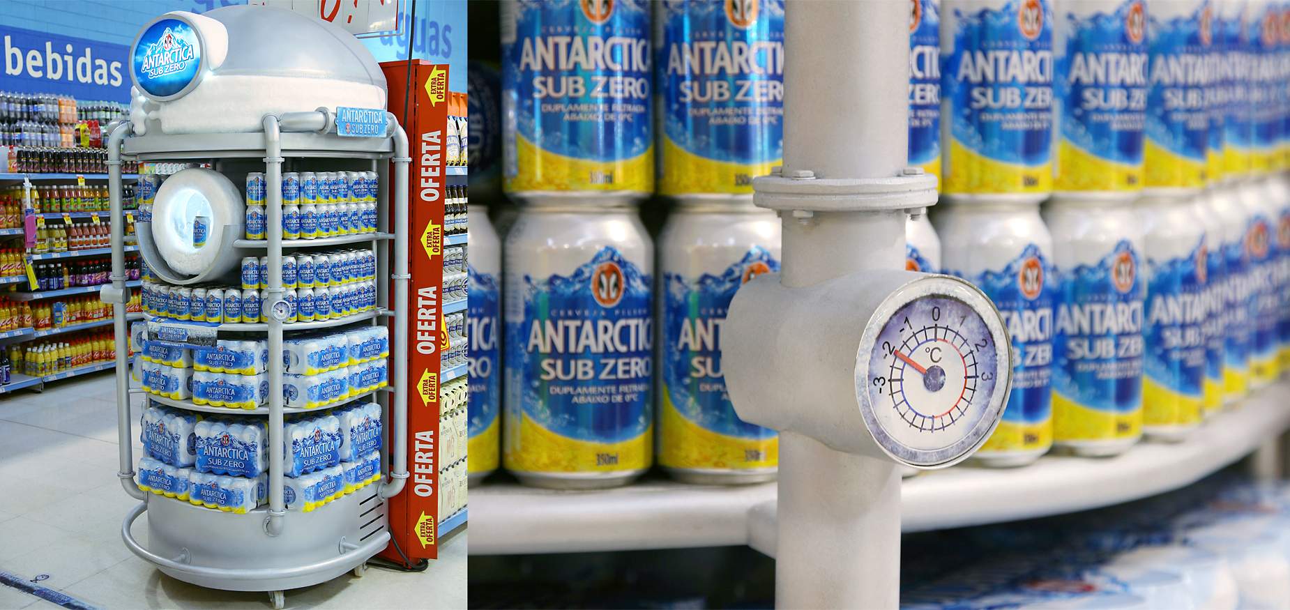 Alinhado à campanha de lançamento da Antarctica Sub Zero, o projeto é inspirado no visual da combinação Fábrica + Gelo. O tonel de cerveja é a principal referência formal do desenho. Tubulações, termômetros e gelo complementam a composição, num resultado de grande apelo conceitual, para transmitir refrescância e os atributos do produto, duplamente filtrado a -2 graus centígrados.